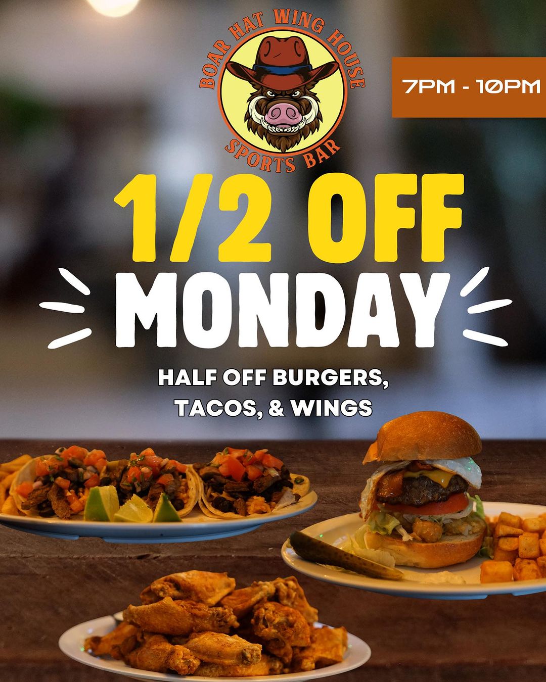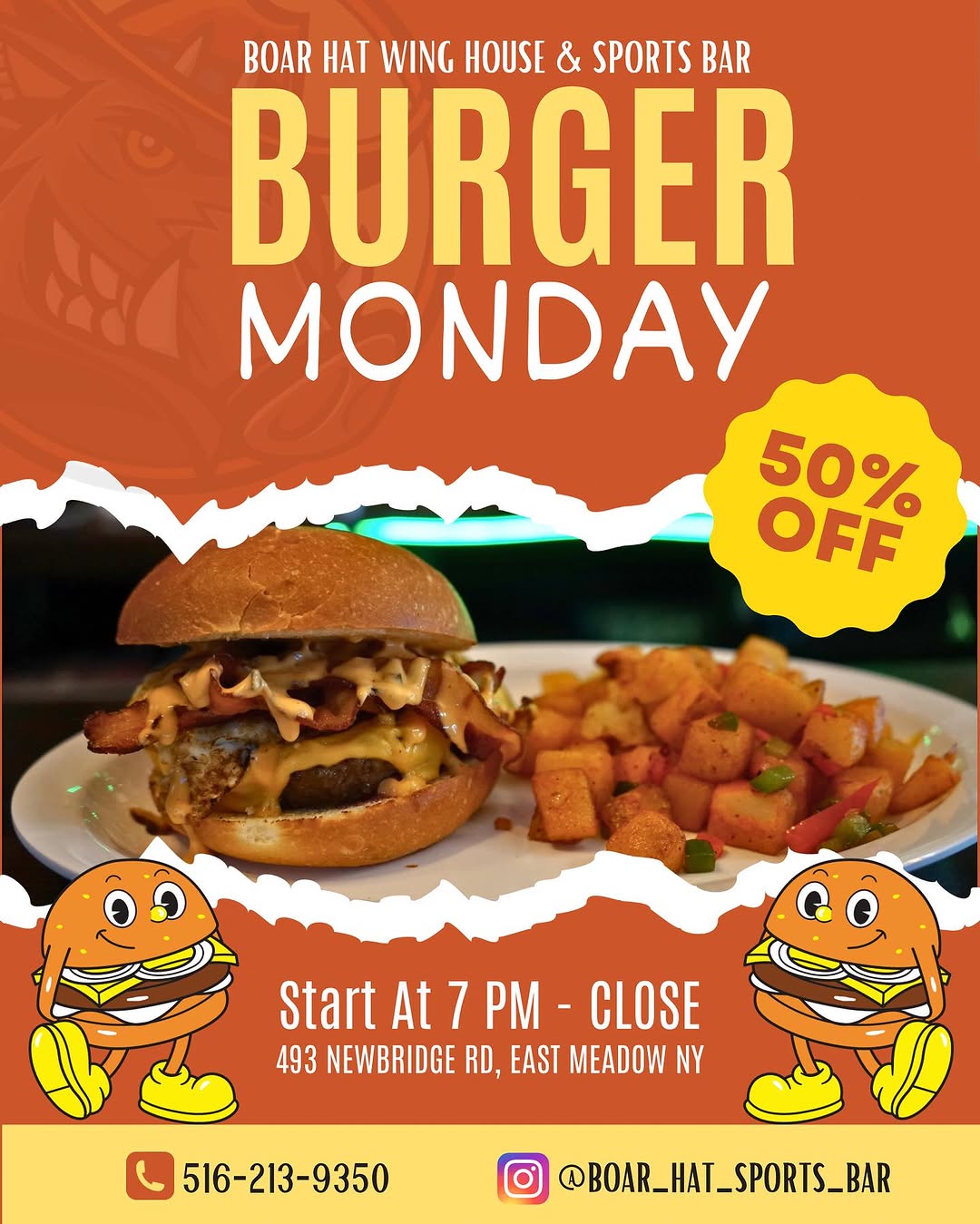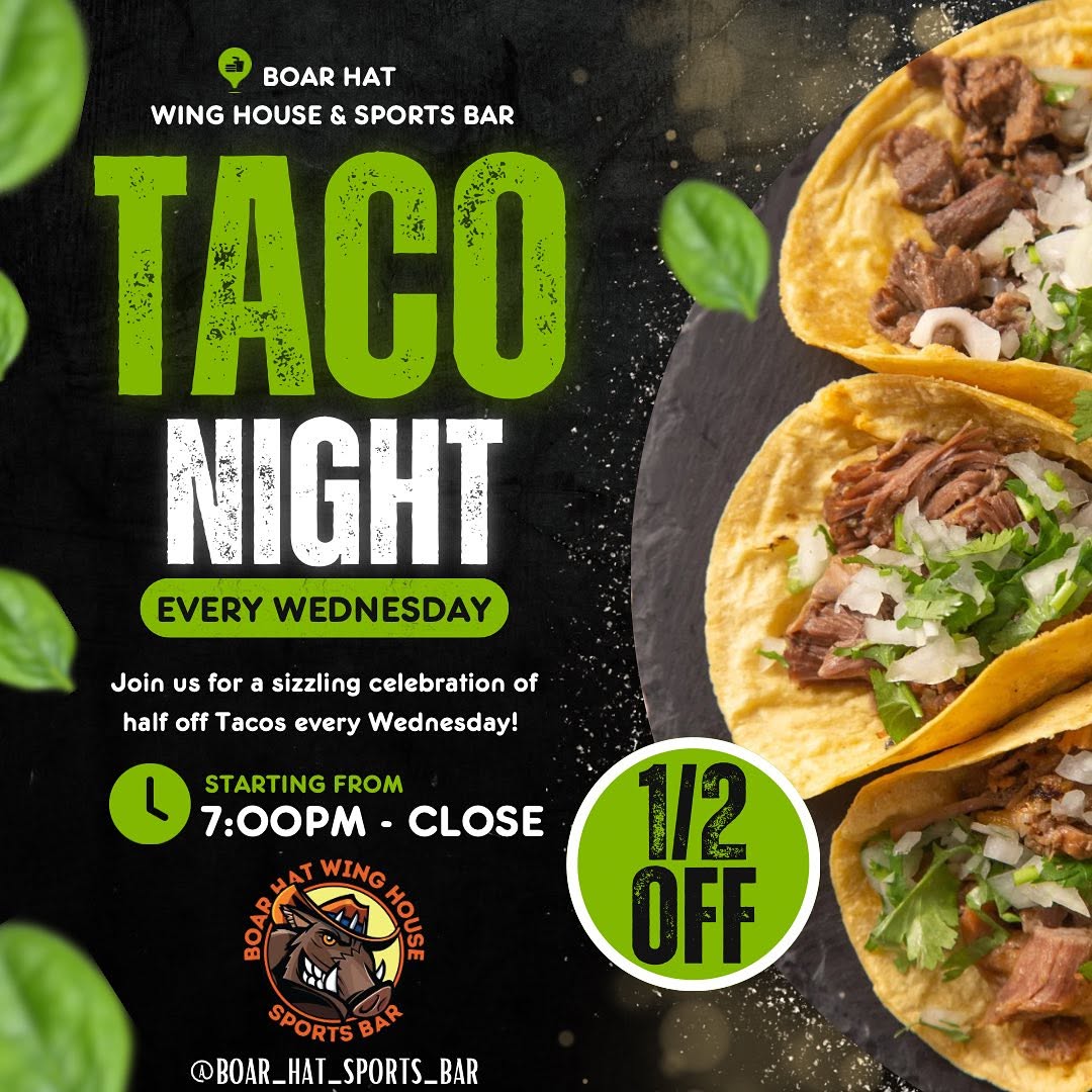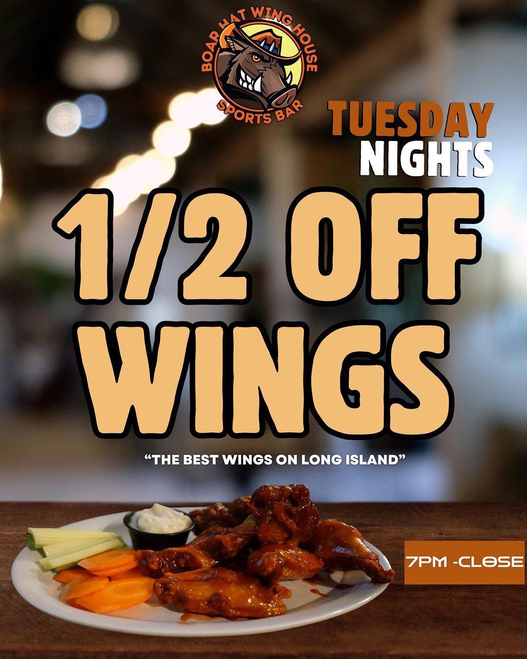 Your go-to late-night spot with The Best Wings on Long Island. Open daily till 4 AM with specials, an all-night kitchen, and nonstop fun. Great food, cold drinks, and live sports – there’s always something happening at Boar Hat!